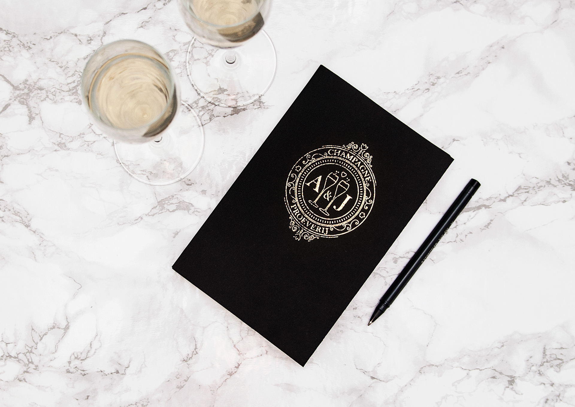 This inspired me to extend the idea of a champagne tasting club (Champagneproeverij in Dutch) into a mini branding project where I could try out some new techniques like foil printing and wax sealing, and also a more premium oriented visual language. I designed a logo, a branded notebook with tasting sheets, letterhead, engraved glasses, and a screenprinted tote to carry bottles in.